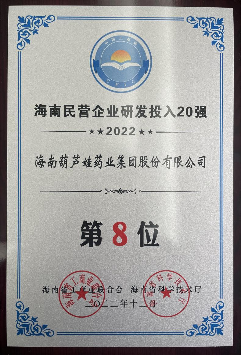 12月23日,2022海南民营企业50强和研发投入20强发布会在海口举行。会上发布了“2022海南民营企业50强”“2022海南民营企业研发投入20强”榜单和分析报告。AG旗舰厅药业再次荣登两榜,在海南民营企业50强榜单中位列第25位,较去年上升8位,这也是公司连续三年登榜;在海南民营企业研发投入20强中位列第8位,较去年上升7位。